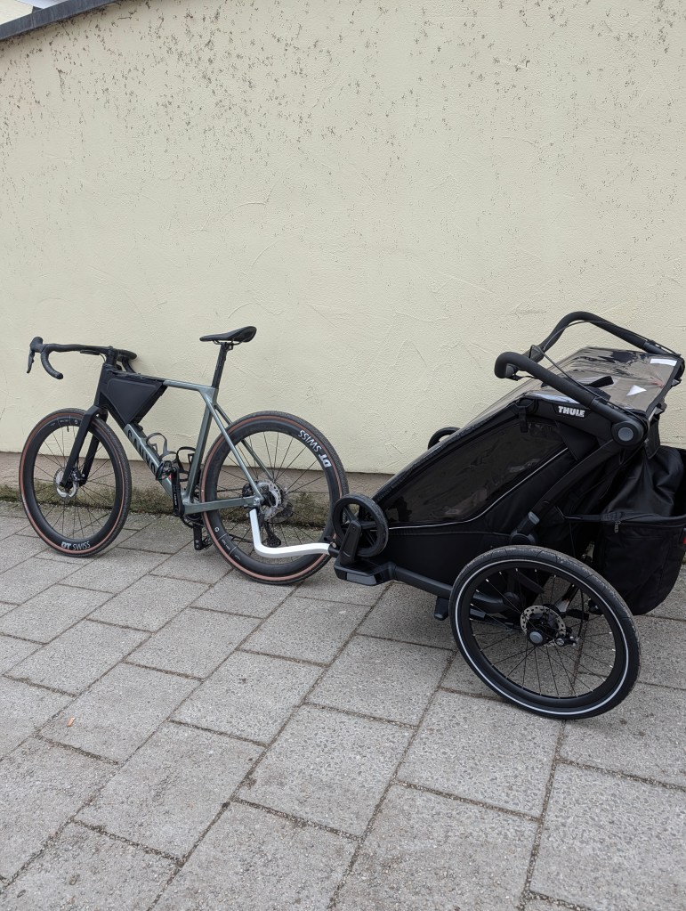 If you’re a bike nerd, you know this isn’t exactly a standard configuration. Putting a high-end, carbon gravel racing machine like the Canyon Grail CF SLX 8 together with a premium child carrier is… well, rare.